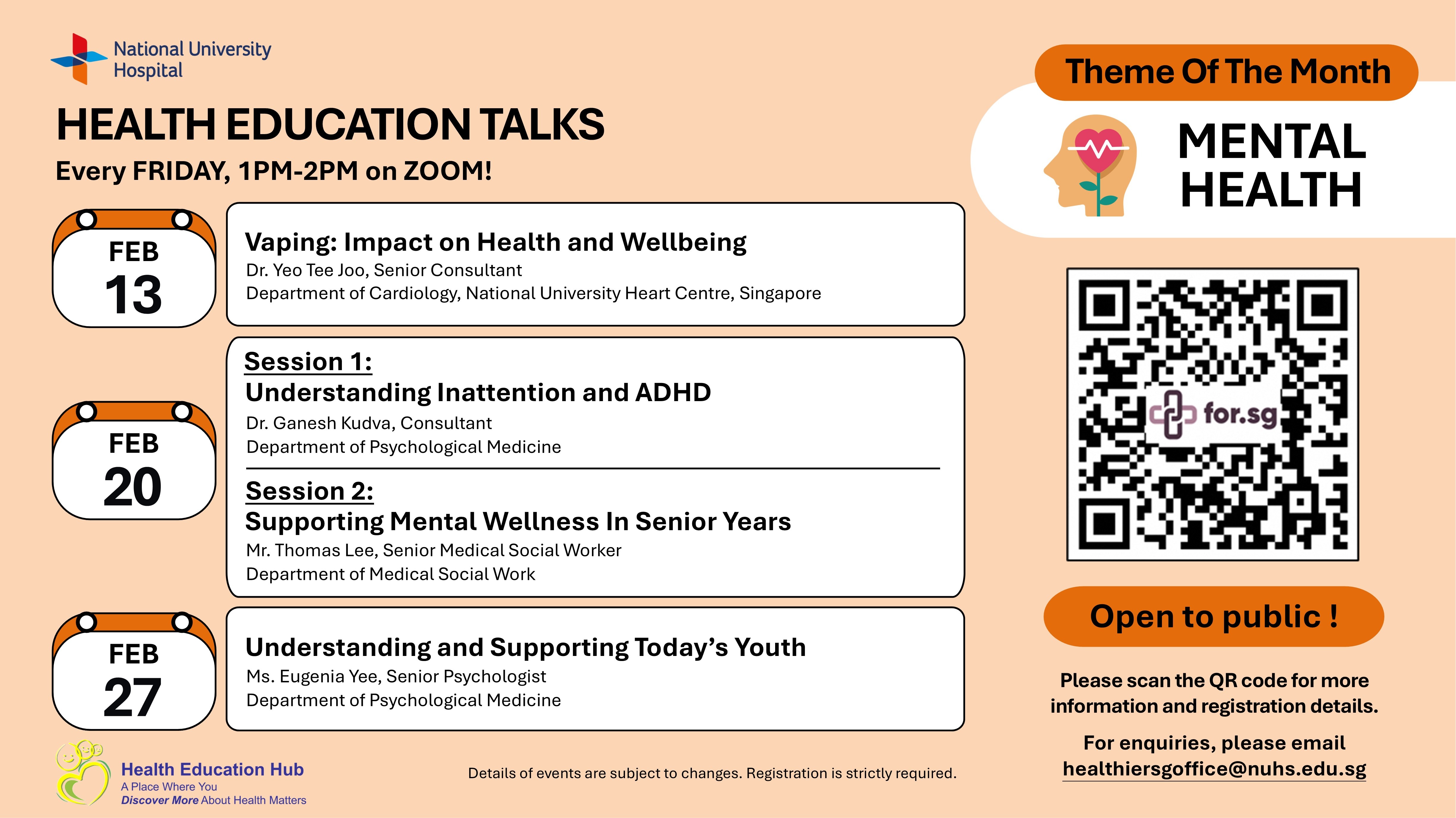 Health Education Talk: Mental Health13 Feb 2026 – Vaping: Impact on Health and Wellbeing 20 Feb 2026 – Understanding Inattention and ADHD & Supporting Mental Wellness in Senior Years Session 1: Understanding Inattention and ADHD Session 2: Understanding Inattention and ADHD 27 Feb 2026 – Understanding and Supporting Today’s Youth More Info/ Registration Link: - For more info or to register, click on the link here - For further queries, please email [email protected] |