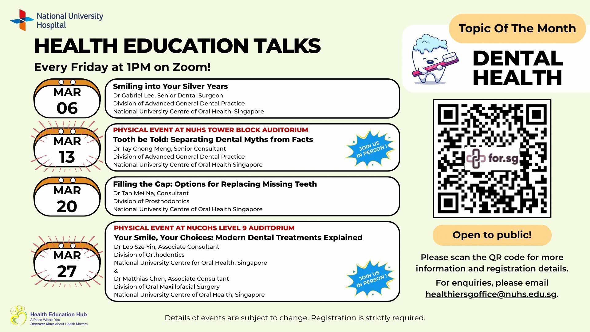 Health Education Talk: Dental Health06 Mar 2026 – Smiling into Your Silver Years 13 Mar 2026 – Tooth be Told: Separating Dental Myths from Facts 20 Mar 2026 – Filling the Gap: Options for Replacing Missing Teeth 27 Mar 2026 – Your Smile, Your Choices: Modern Dental Treatments Explained More Info/ Registration Link: - For more info or to register, click on the link here - For further queries, please email [email protected] |